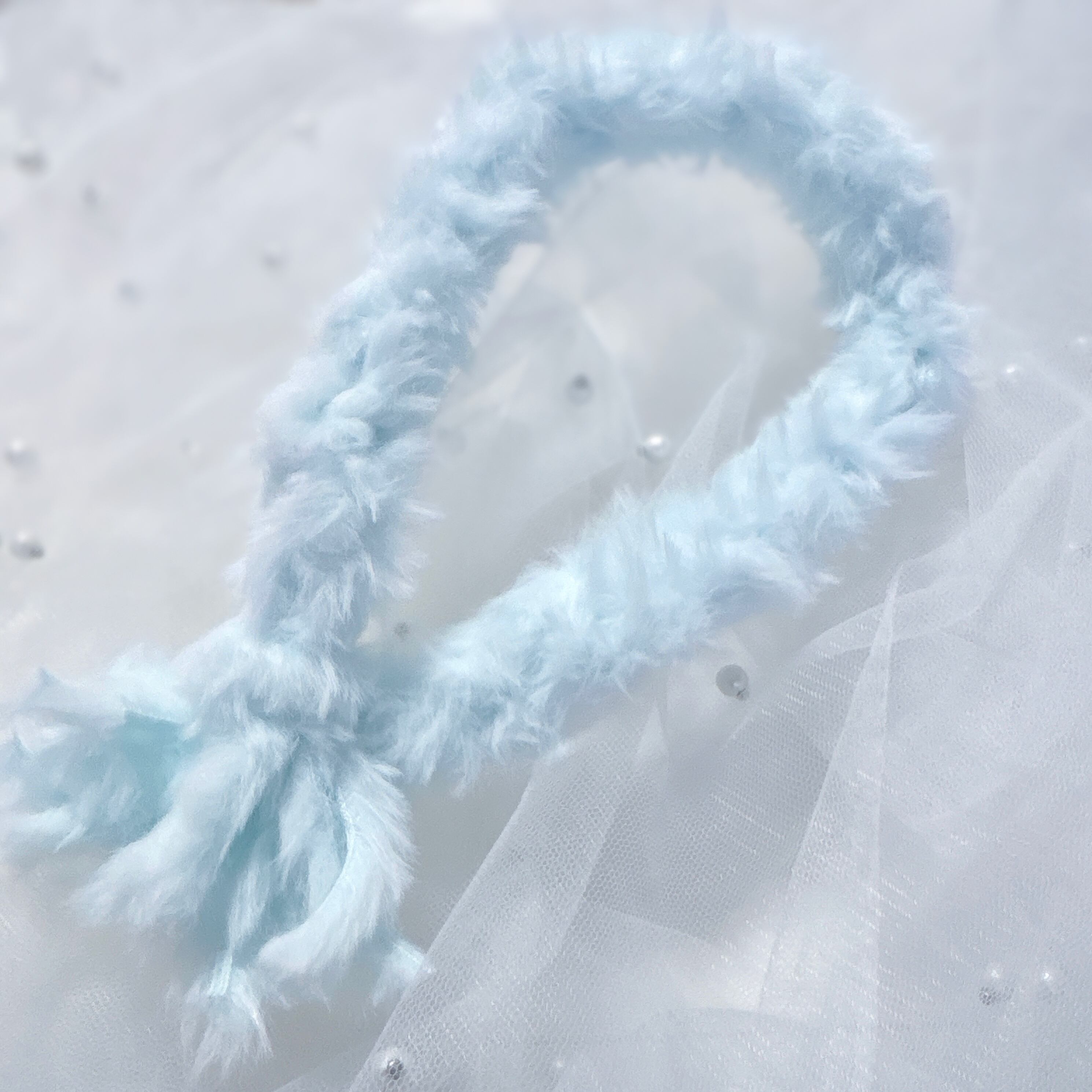 ふわふわライトブルーは毛足が長く、パール飾りのテグスが絡まる為、マフラーを留められるパール飾りなしです!